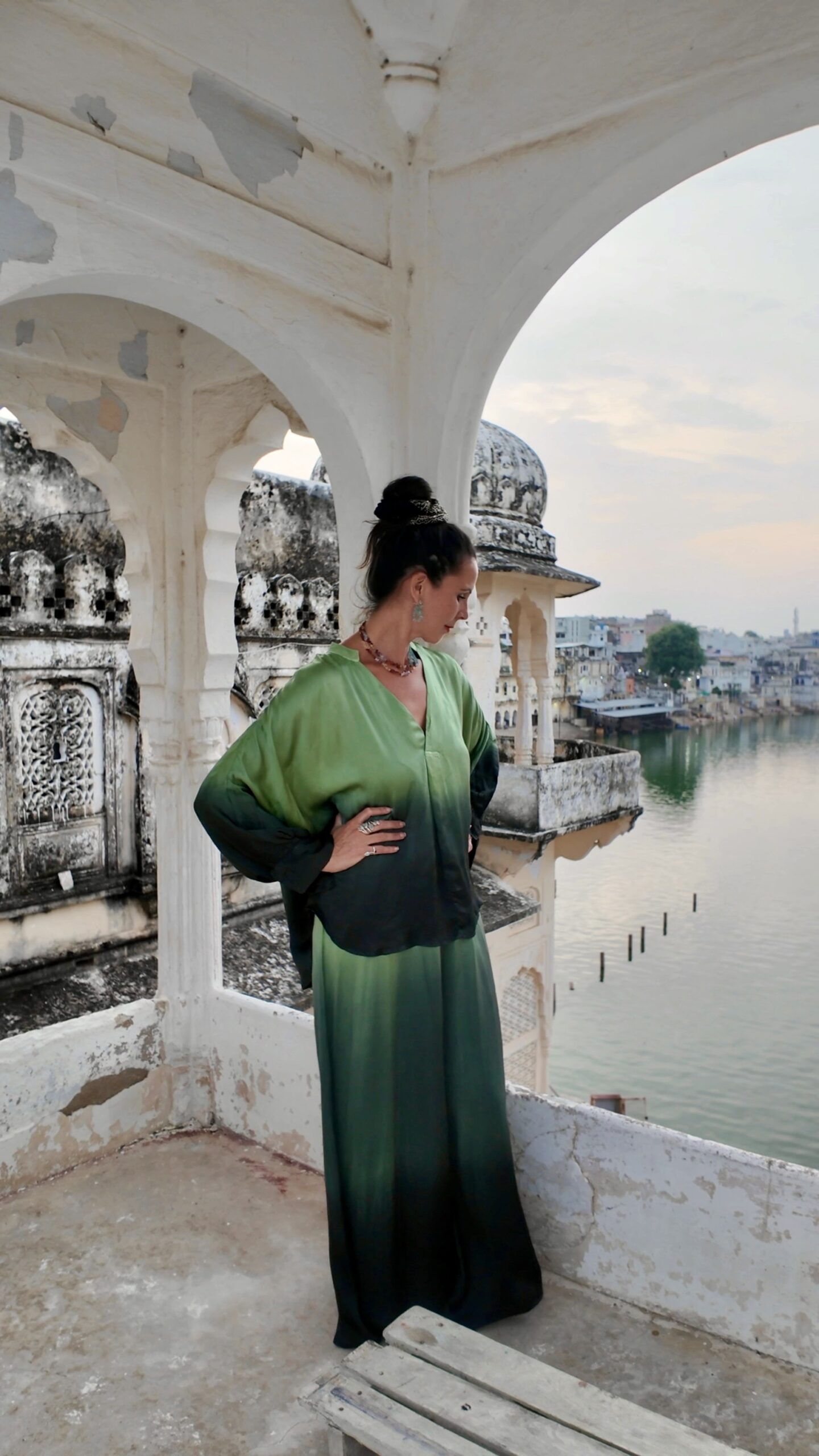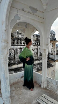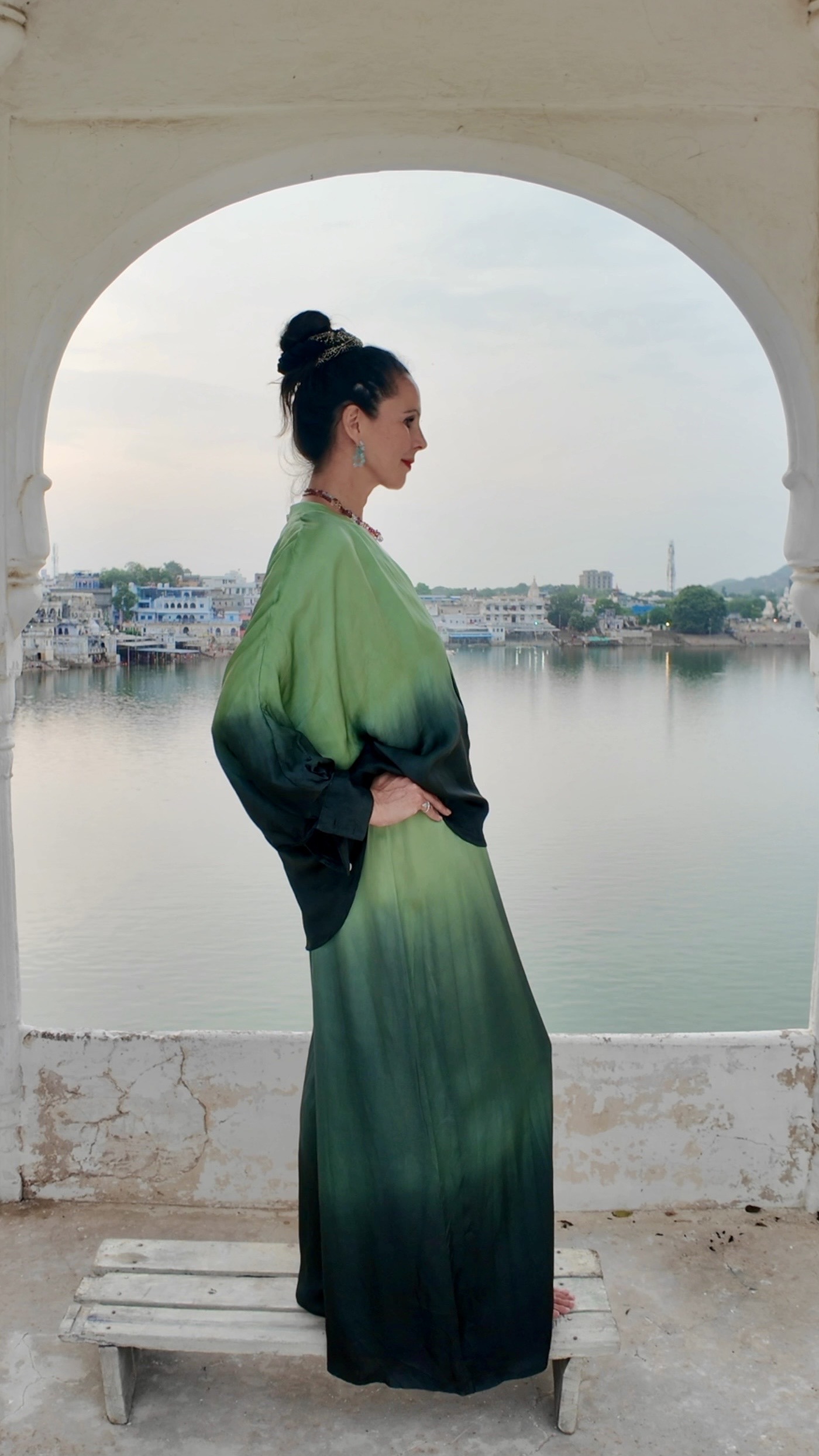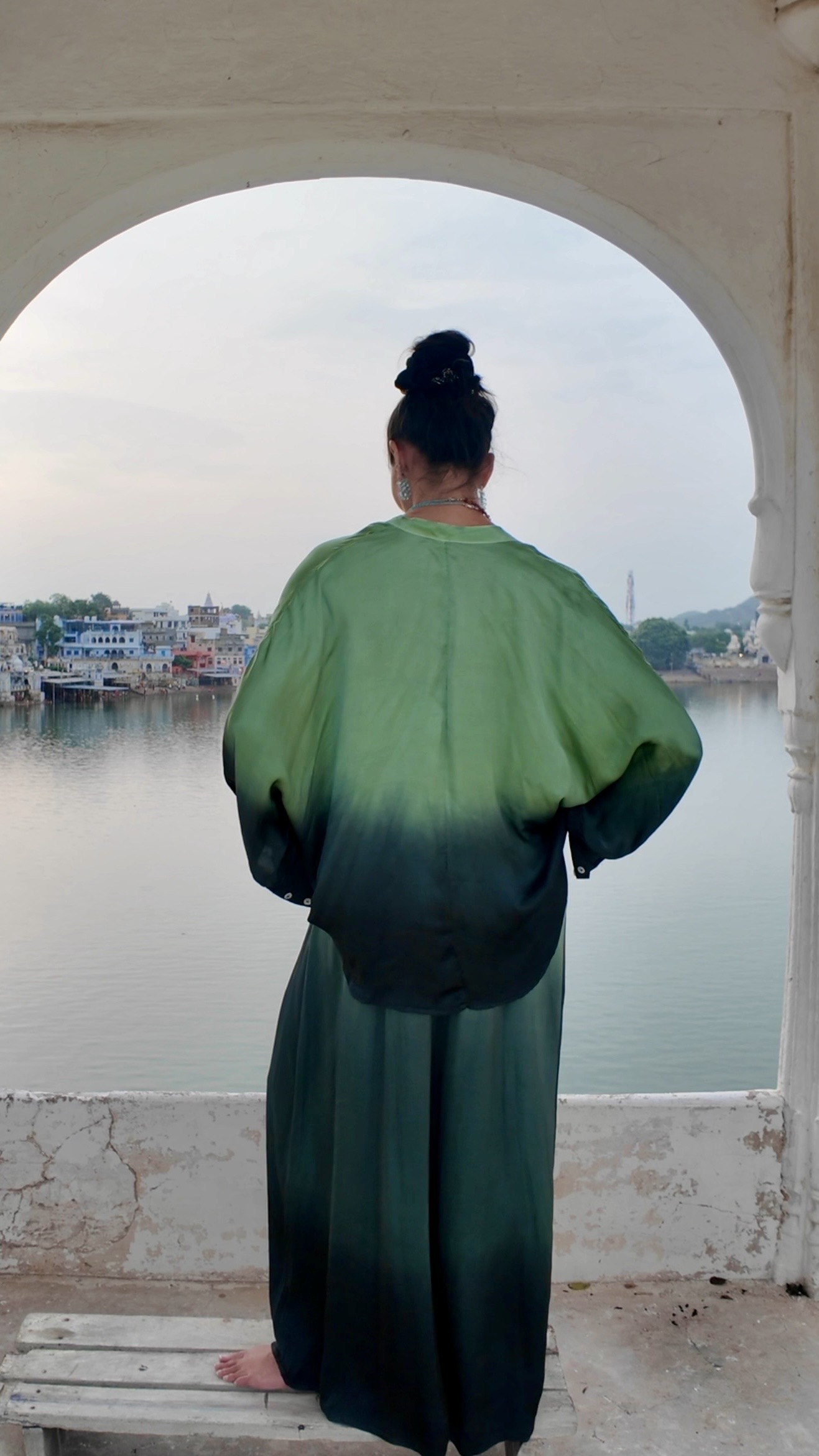 Camisa cuello mao y escote V, es amplia tipo oversize ,técnica ombré en degradé de verdes , puños con botones, Free Size.