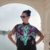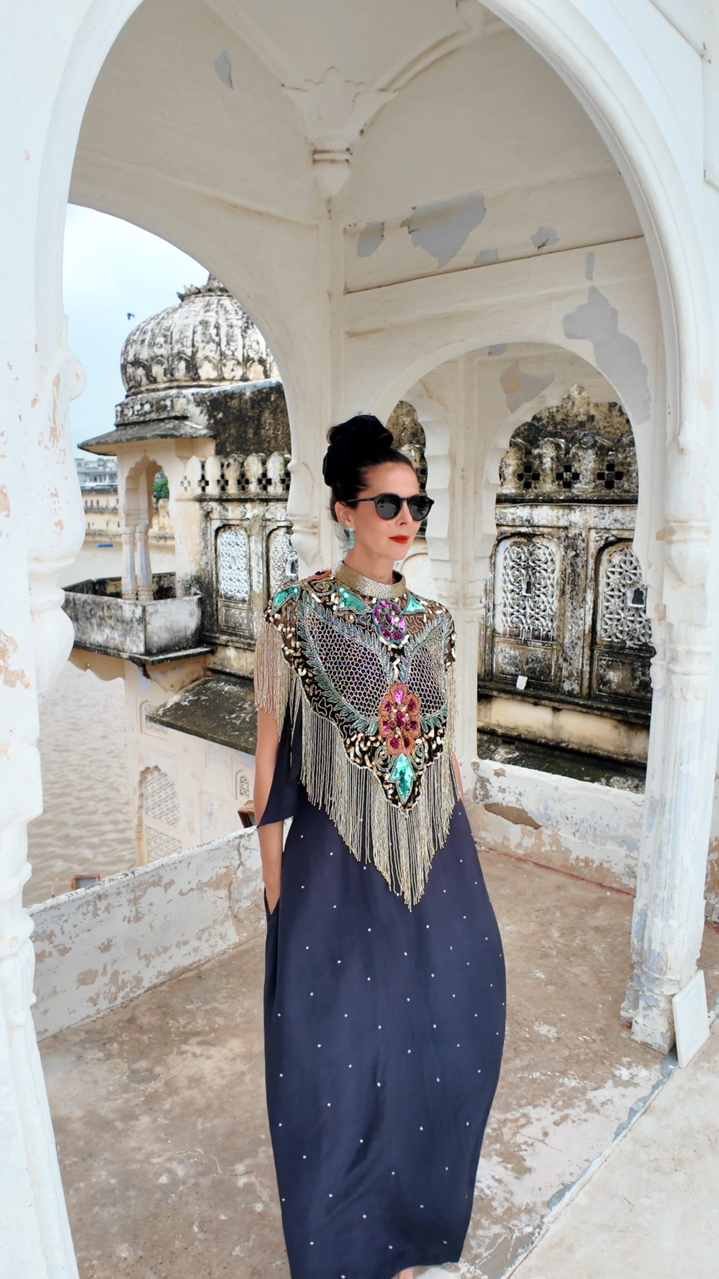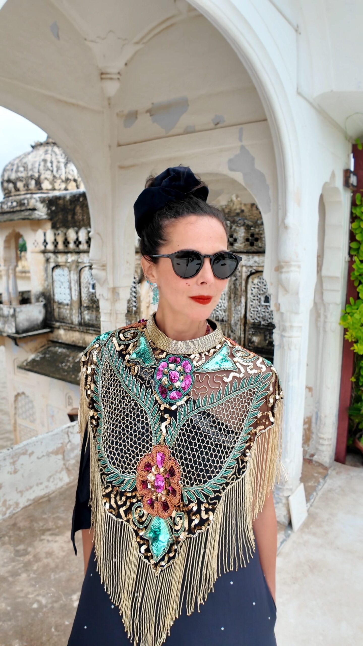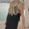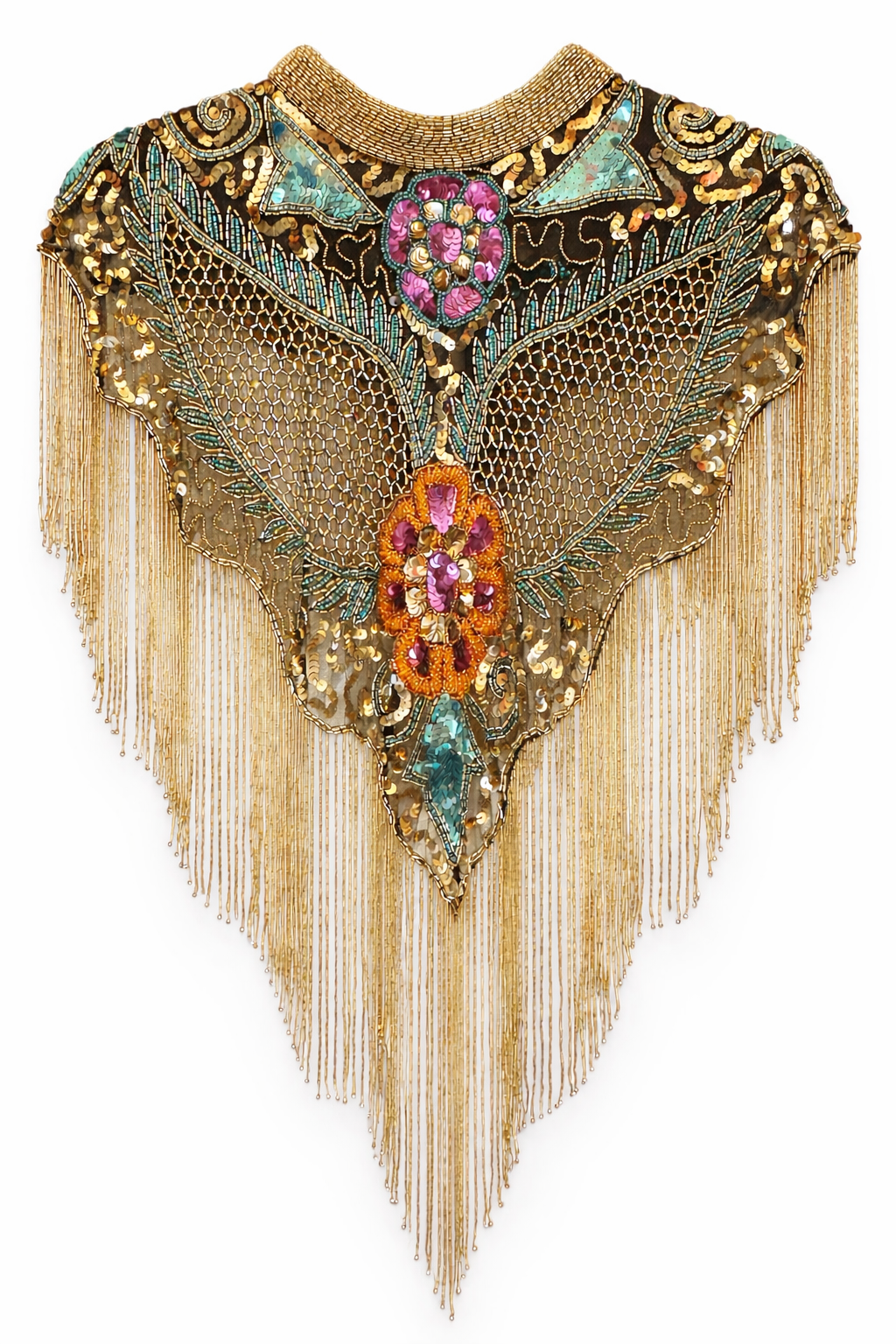 Capa bordada en V con mostacillas doradas de base y diseño de Alas central , lentejuelas y mostacillas de colores, caída con flecos sobre los hombros, el contorno de cuello está acolchado para evitar el roce y comodidad de uso.
