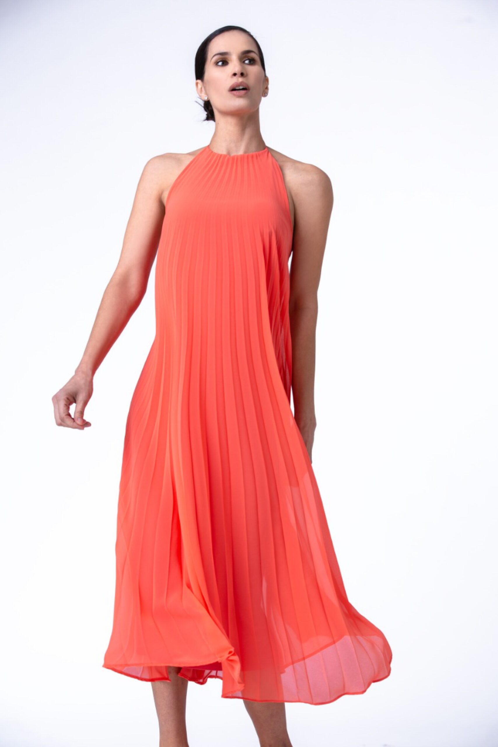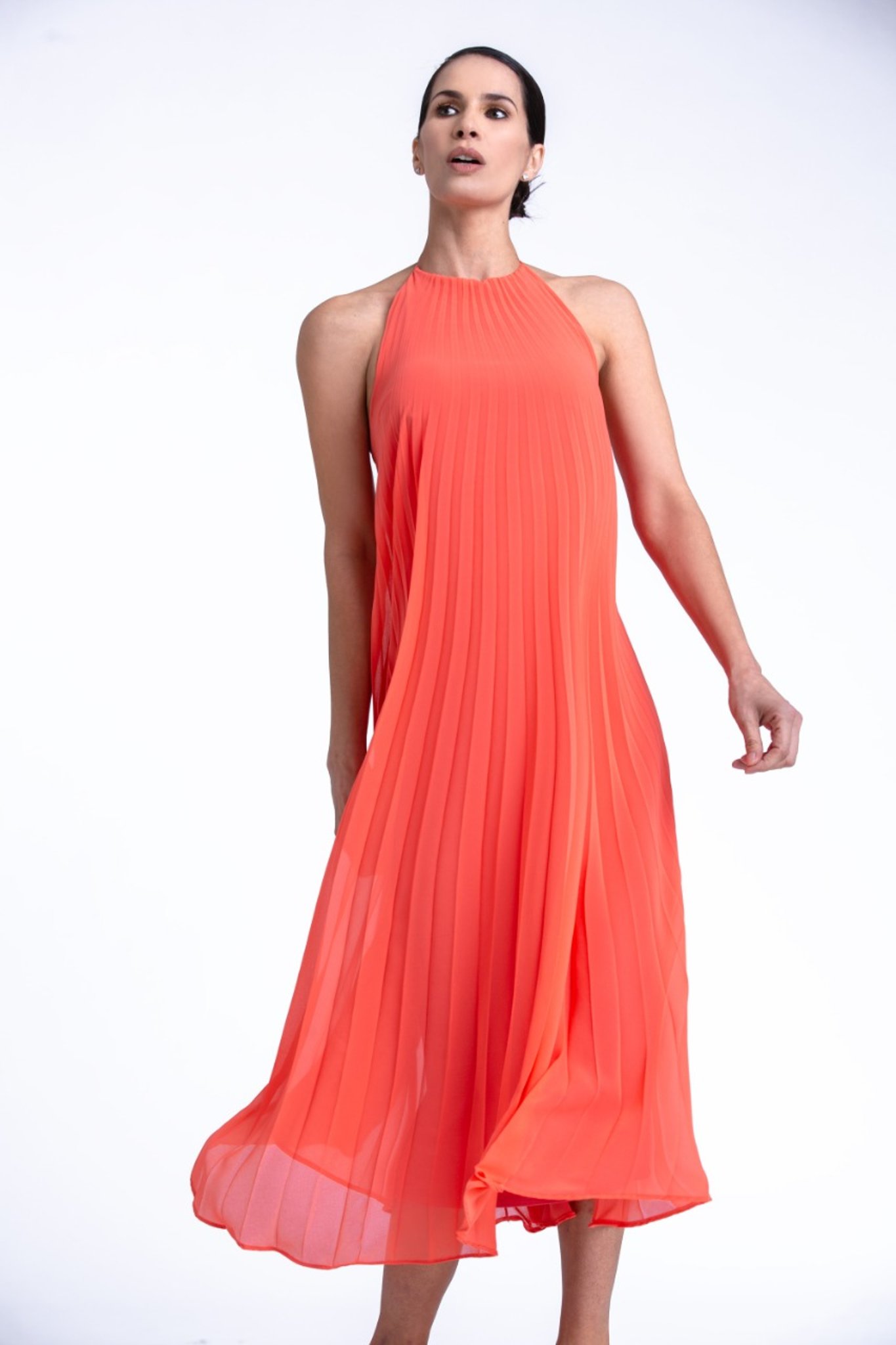 Este es un plisado soleil de gasa coral , escote halter al cuello y escote en v en la espalda.