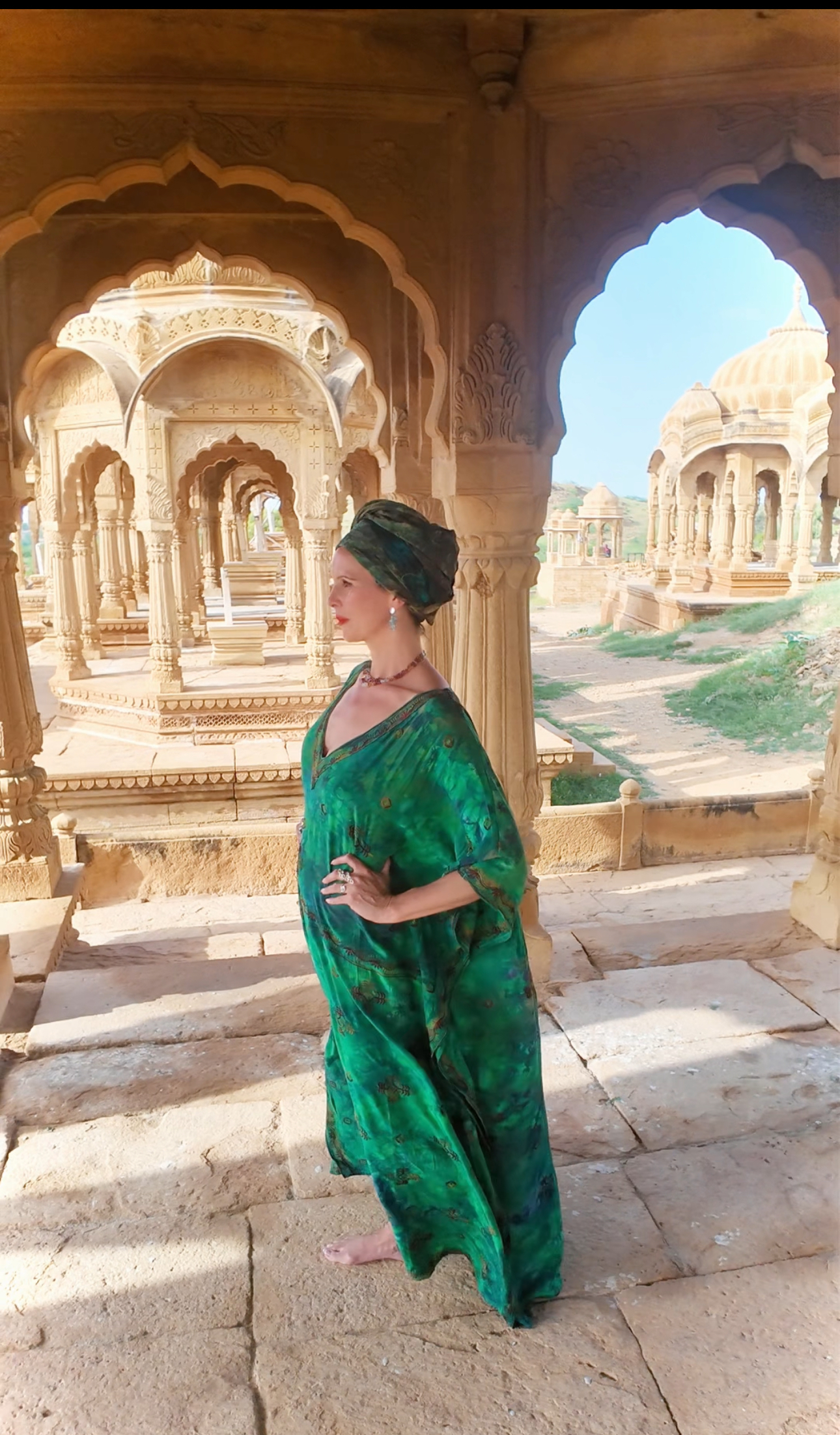 Una pequeña colección de 3 diferentes diseños, Kaftanes y Vestidos escotes en V con y sin mangas , saree 100% seda reciclada, escogidas una a una , telas con unas caídas y movimientos propios de la real seda , detalles de aplicaciones de mostacillas, cuentas y bordados a mano , cada uno de estos vestidos tiene una alegre historia en el proceso.